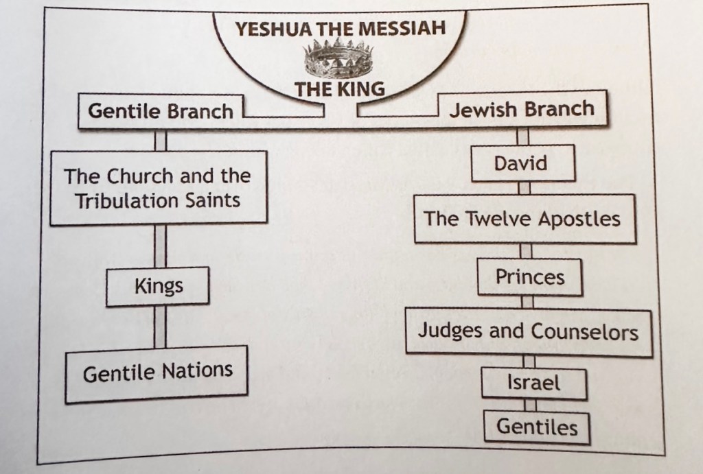 This week, we are looking at the second branch of the Millennial government, the Jewish branch. Fruchtenbaum does an amazing job of clarifying what this looks like. Here is his Messianic chain of command chart that I posted last week.
